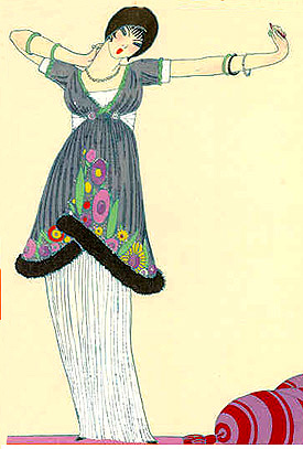Zeichnung von Paul IribeIm Gegensatz zu den Entwürfen seiner Zeitgenossen sind Poirets Modelle erstmals ohne Korsett tragbar und wirken dabei nicht nur modisch, sondern ausgesprochen elegant – für die damalige Zeit eine echte Revolution. Er führt sogar Hosenröcke ein, die bislang nur von Radfahrerinnen getragen werden, und erweitert damit die Möglichkeiten der Damenmode erheblich.