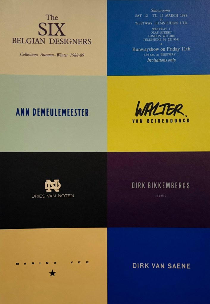 The group included the designers Dirk Bikkembergs, Ann Demeulemeester, Walter Van Beirendonck, Dries Van Noten, Dirk Van Saene, and Marina Yee.