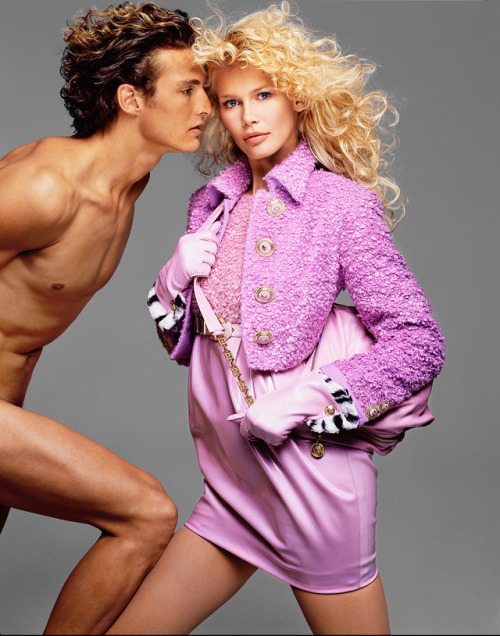 Dieses Shooting sorgte zuerst für ein wenig Verlegenheit. Doch Claudia Schiffer macht es bereits in den 1990er Jahren zusammen mit Stan Nelson vor. Für die Versace Kampagne 1994 wurden die beiden in ähnlichen Posen, aber vor allem er nackt und sie angezogen, fotografiert. Es folgen zwei Referenzbilder.