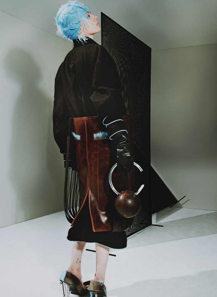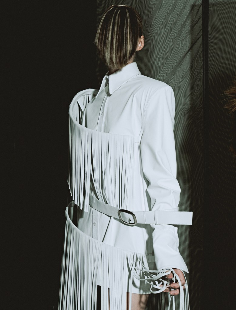 Paula Van Dijck’s master’s collection explores superficiality as a coping mechanism. Drawing from personal experience, she examines how beauty and external presentation can act as emotional armor. Using materials like leather, fringes, and spikes, her designs blend elegance with defense. Wigs reinforce the theme of transformation and identity play. The collection reflects a balance between vulnerability and strength, control and exposure.