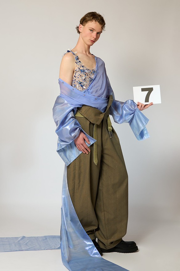 Annaëlle Reudink’s final collection responds to the dreaded question “What’s your plan for the future?” with freedom and imagination. Inspired by artists like Rinus Van de Velde, Cindy Sherman, and Leigh Bowery, she uses fashion to embody multiple selves—each silhouette representing a life she might have lived. From a grandmother to a ballerina, her collection becomes a dream diary, celebrating transformation, possibility, and the refusal to be just one thing.