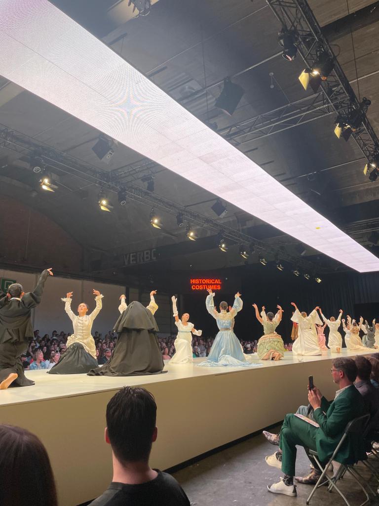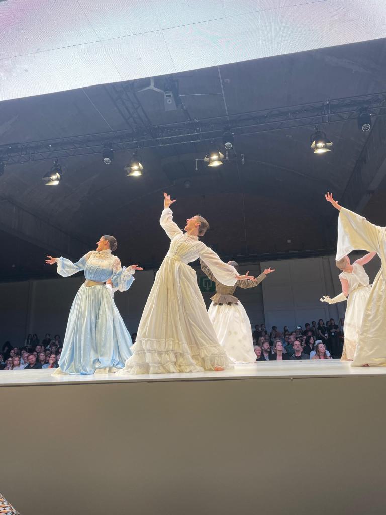 Die Studierenden des zweiten Jahres präsentierten Looks, die vergangenen Epochen nachempfunden waren – insbesondere der Zeit vor dem 20. Jahrhundert. Mit großer Sorgfalt und beeindruckender Detailgenauigkeit gefertigt, überzeugten die Kostüme nicht nur handwerklich. Vor allem die Inszenierung sorgte für Gänsehaut: Was zunächst wie eine klassische Laufstegpräsentation begann, entwickelte sich innerhalb kürzester Zeit zu einer tänzerischen Performance, die den historischen Gewändern neues Leben einhauchte. Eine ausführliche Beschreibung würde diesem Moment kaum gerecht – daher: seht selbst!