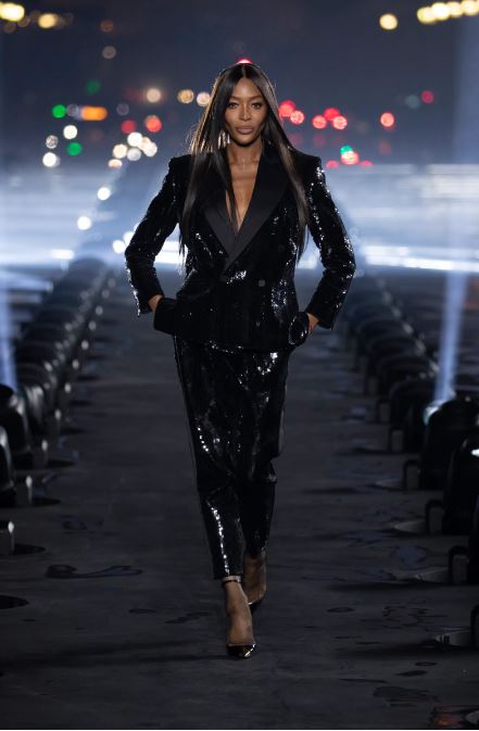 Bei Naomi Campbell hätte man wahrscheinlich jeden Runway-Moment als Highlight deklarieren können. Wobei die Frühling/Sommer Show von Saint Laurent aus dem Jahr 2020 ein besonderes Highlight darstellt – Paris bei Nacht, der leuchtende Eiffelturm, Scheinwerfer und Naomi Campbell schließt die Show.