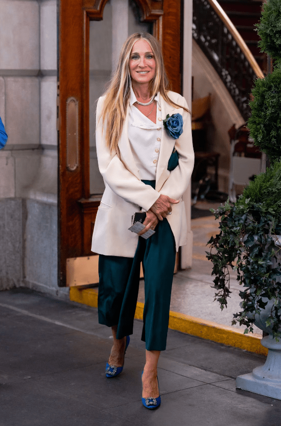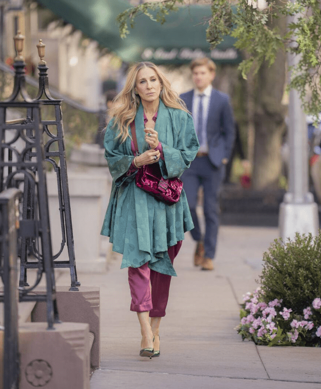 A closer look at the reboot reveals that one color, in particular, repeatedly appears throughout the series: teal. The feather embellishment on her wedding dress, which represented a bird, was already chosen in this color. In the sequel, it is highlighted again with a matching teal coat. Further looks follow, in which Carrie Bradshaw expertly incorporates this color.