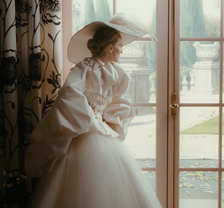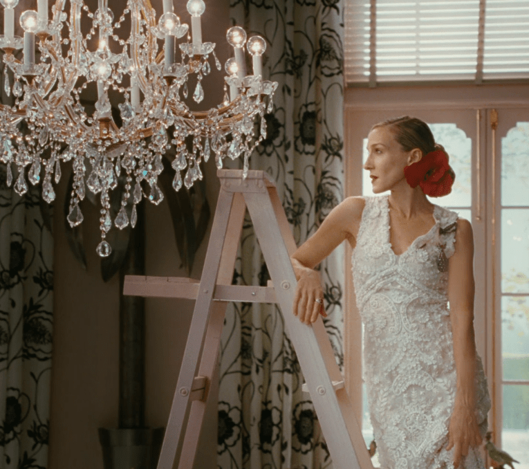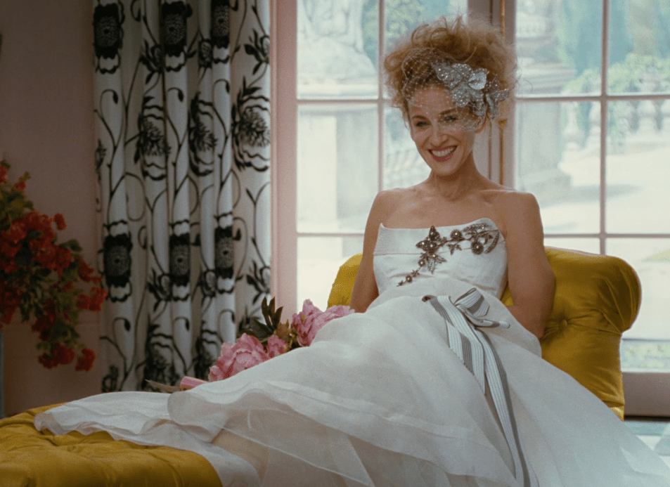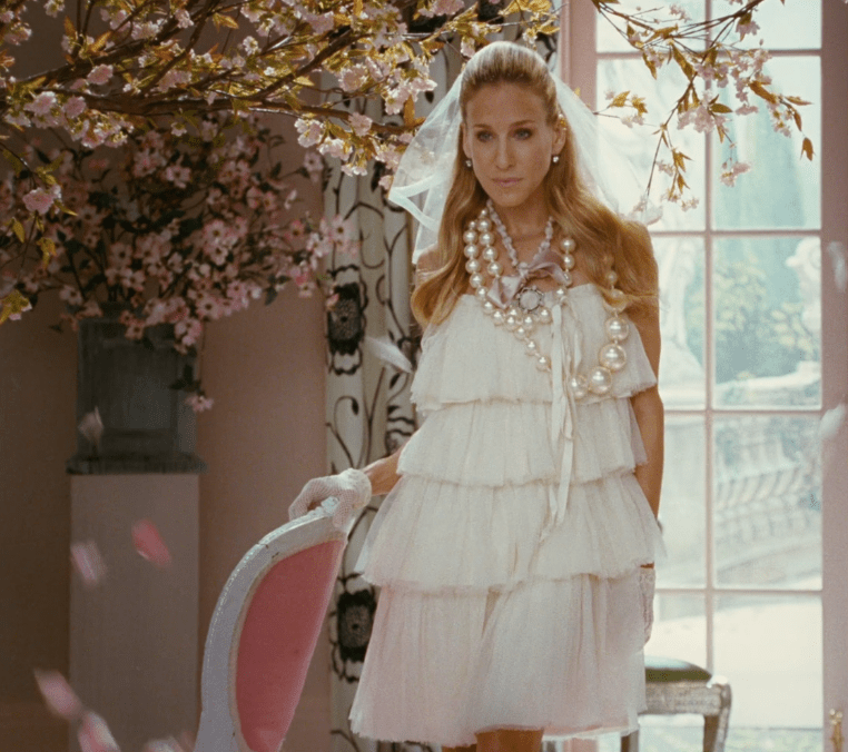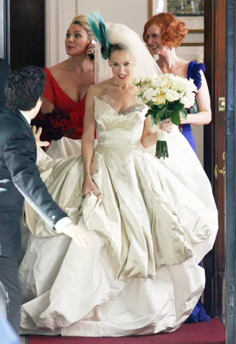 Im ersten Film dreht sich alles um die Hochzeit von Carrie und Mr. Big. Für Vogue lässt sich Carrie in den unterschiedlichsten Hochzeitskleidern von großen Designern fotografieren und erscheint so in der amerikanischen Ausgabe. Die letzten drei Bilder zeigen das Kleid, in dem Carrie Mr. Big heiraten wollte. Das Kleid wurde von Vivienne Westwood designt.