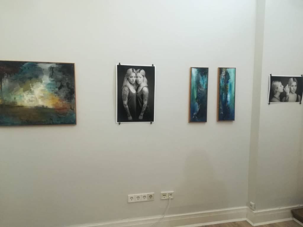 2018 kam die Dialogausstellung zustande: Die Annäherung Herrn Triebelhorns an die Künstlerinnen mittels Fotografie gepaart mit den gemeinsamen Werken der beiden sorgt für eine spannende Mischung. Die in schwarz-weiß gehaltenen Fotografien hingen immer zwischen den Werken, die zwar von Alena und Aline separat entstanden sind, aber doch eine geteilte Gefühlswelt wiederspiegelten. Vergleichbar mit Kaffeebohnen in einer Parfümerie, an denen gerochen wird, um den Geruchssinn zu neutralisieren, wirkten die Portraits der beiden zwischen den bunten und aufregenden Werken: Beruhigend und klar.